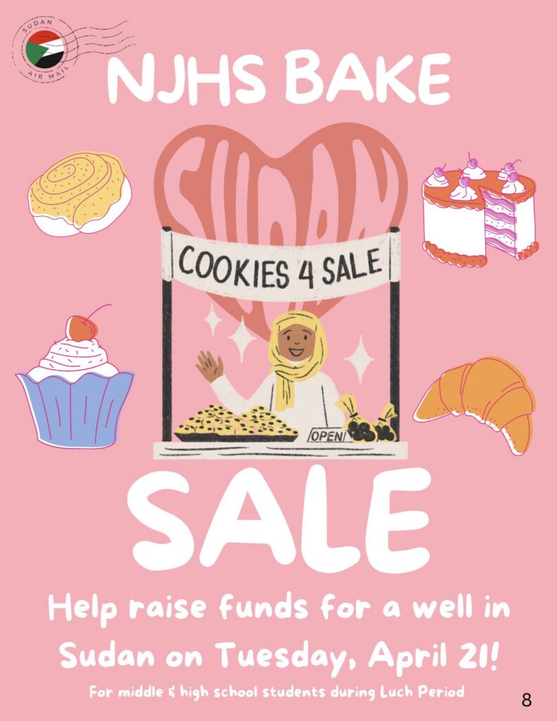 Enjoy an NJHS Bake Sale to help raise funds for a well in Sudan on Tuesday, April 21! There will be cookies for sale for middle and high school students during lunch period.