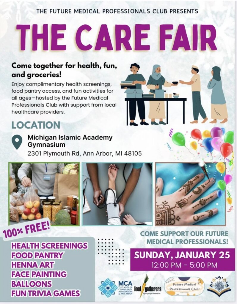 The Future Medical Professionals Club presents the care fair on Sunday, January 25 from noon to 5:00 p.m. in the Michigan Islamic Academy gymnasium. Enjoy complimentary health screenings, food pantry access, and fun activities for all ages. Come together for health, fun, and groceries!